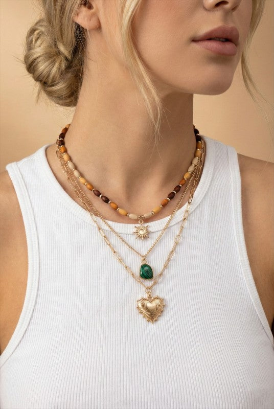 The longest strand is a medium link chain showcasing a green stone pendant and a textured gold heart charm for a playful and romantic finish.